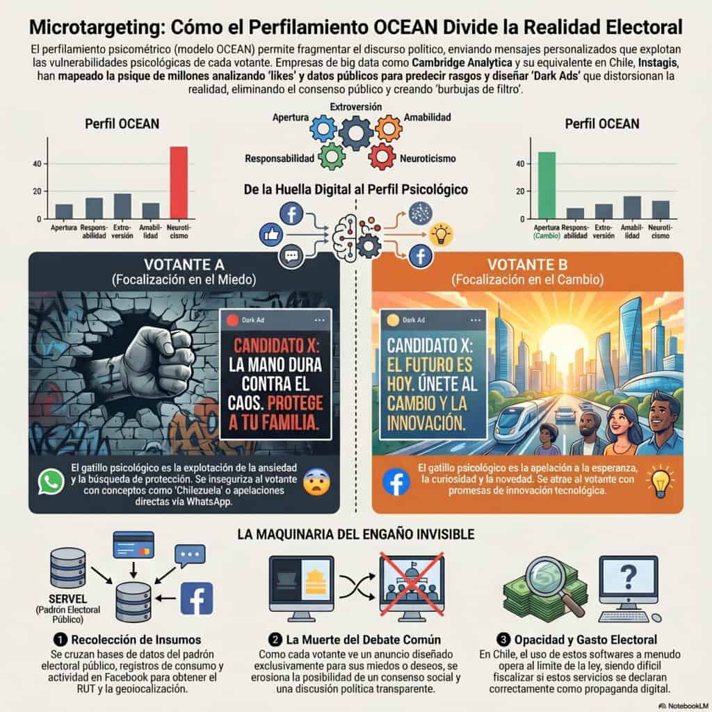Al Votante A se le moviliza a través del miedo; al Votante B, a través de la esperanza. Ninguno de los dos ve el anuncio del otro, erosionando cualquier posibilidad de consenso social.