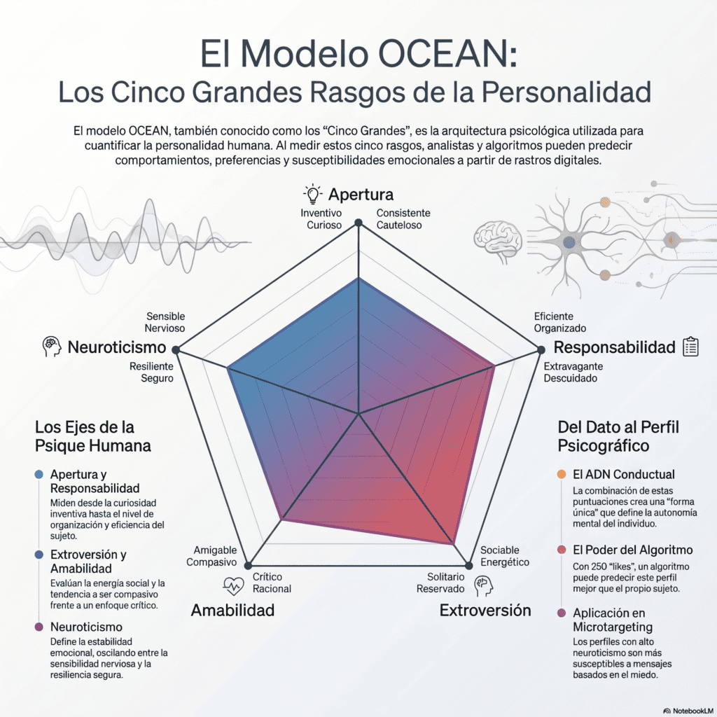 El éxito de Cambridge Analytica no radicó en la tecnología per se, sino en la psicometría. A diferencia del marketing tradicional, que agrupa por edad o ubicación, Cambridge Analytica utilizó el modelo OCEAN para mapear la psique de 87 millones de personas.